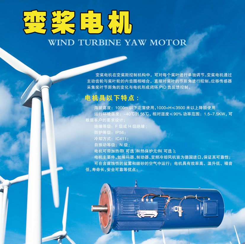 WIND TURBINE YAW MOTOR The pitch motor in variable pitch control mechanism, can be adjusted separately for each blade. The inner gear ring gear and the paddle wheel is engaged, directly controls the blade pitch angle. Displacement sensor to collect the blade pitch angle changes and the formation of PID motorclosed-loop negative feedback control.